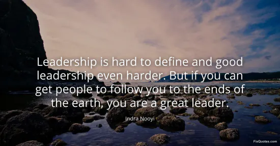 Nooyi, Indra. (2026, January 15). Leadership is hard to define and good leadership even harder. But if you can get people to follow you to the ends of the earth, you are a great leader. FixQuotes. https://fixquotes.com/quotes/leadership-is-hard-to-define-and-good-leadership-142806/