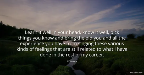 Jarreau, Al. "Learn it well in your head, know it well, pick things you know and bring the old you and all the experience you have from singing these various kinds of feelings that are still related to what I have done in the rest of my career." FixQuotes. January 15, 2026. https://fixquotes.com/quotes/learn-it-well-in-your-head-know-it-well-pick-161858/.