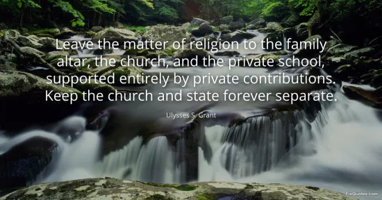 Grant, Ulysses S. (2026, January 15). Leave the matter of religion to the family altar, the church, and the private school, supported entirely by private contributions. Keep the church and state forever separate. FixQuotes. https://fixquotes.com/quotes/leave-the-matter-of-religion-to-the-family-altar-2206/