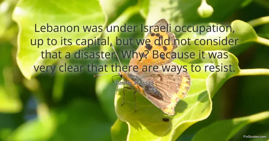 al-Assad, Bashar. "Lebanon was under Israeli occupation, up to its capital, but we did not consider that a disaster. Why? Because it was very clear that there are ways to resist." FixQuotes. January 17, 2026. https://fixquotes.com/quotes/lebanon-was-under-israeli-occupation-up-to-its-37575/.