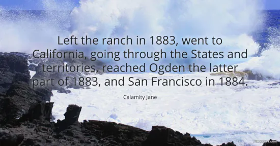 Jane, Calamity. "Left the ranch in 1883, went to California, going through the States and territories, reached Ogden the latter part of 1883, and San Francisco in 1884." FixQuotes. January 18, 2026. https://fixquotes.com/quotes/left-the-ranch-in-1883-went-to-california-going-16918/.