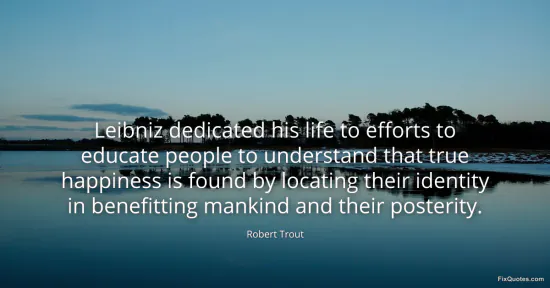 Trout, Robert. "Leibniz dedicated his life to efforts to educate people to understand that true happiness is found by locating their identity in benefitting mankind and their posterity." FixQuotes. January 16, 2026. https://fixquotes.com/quotes/leibniz-dedicated-his-life-to-efforts-to-educate-89501/.