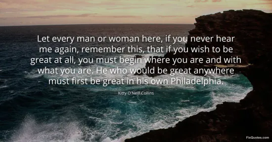 Collins, Kitty O'Neill. "Let every man or woman here, if you never hear me again, remember this, that if you wish to be great at all, you must begin where you are and with what you are. He who would be great anywhere must first be great in his own Philadelphia." FixQuotes. January 15, 2026. https://fixquotes.com/quotes/let-every-man-or-woman-here-if-you-never-hear-me-170879/.