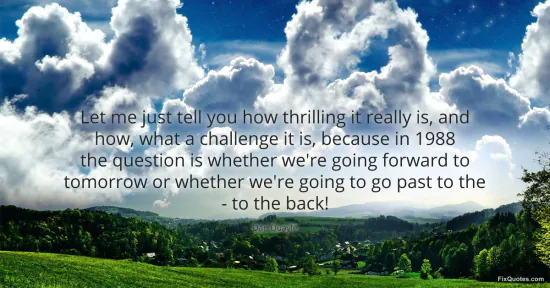 "Let me just tell you how thrilling it really is, and how, what a challenge it is, because in 1988 the question is whether we're going forward to tomorrow or whether we're going to go past to the - to the back!" FixQuotes, 15 Jan. 2026, https://fixquotes.com/quotes/let-me-just-tell-you-how-thrilling-it-really-is-9572/. Accessed 12 Feb. 2026.