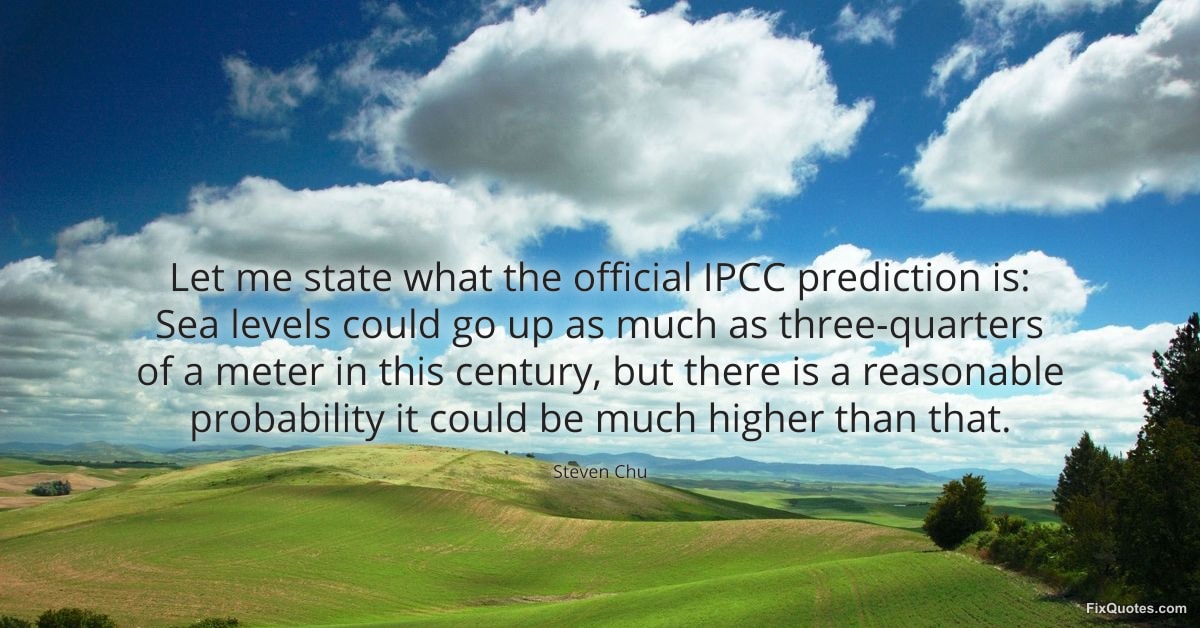 Chu, Steven. (2026, January 17). Let me state what the official IPCC prediction is: Sea levels could go up as much as three-quarters of a meter in this century, but there is a reasonable probability it could be much higher than that. FixQuotes. https://fixquotes.com/quotes/let-me-state-what-the-official-ipcc-prediction-is-78236/