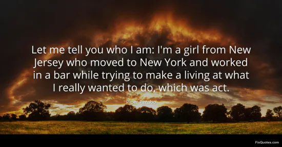 Perabo, Piper. "Let me tell you who I am: I'm a girl from New Jersey who moved to New York and worked in a bar while trying to make a living at what I really wanted to do, which was act." FixQuotes. January 16, 2026. https://fixquotes.com/quotes/let-me-tell-you-who-i-am-im-a-girl-from-new-105152/.