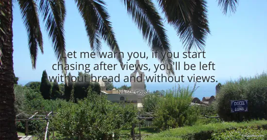 Gogol, Nikolai. "Let me warn you, if you start chasing after views, you'll be left without bread and without views." FixQuotes. January 18, 2026. https://fixquotes.com/quotes/let-me-warn-you-if-you-start-chasing-after-views-4488/.