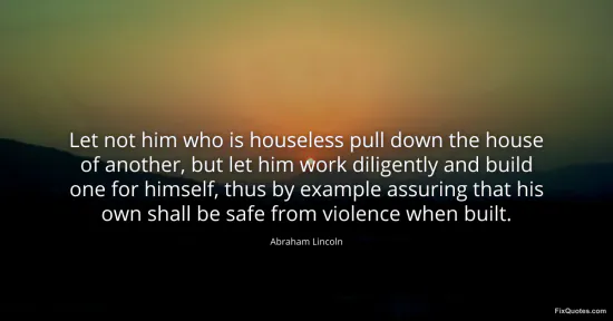 Lincoln, Abraham. (2026, January 18). Let not him who is houseless pull down the house of another, but let him work diligently and build one for himself, thus by example assuring that his own shall be safe from violence when built. FixQuotes. https://fixquotes.com/quotes/let-not-him-who-is-houseless-pull-down-the-house-17750/
