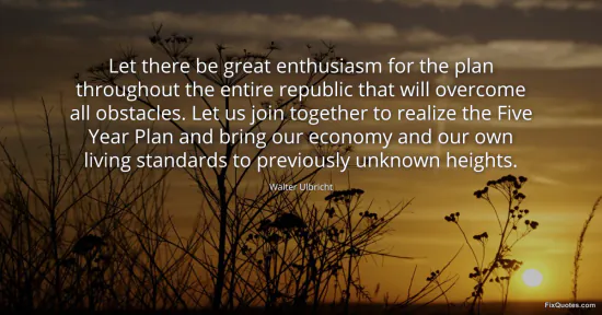 Ulbricht, Walter. (2026, January 16). Let there be great enthusiasm for the plan throughout the entire republic that will overcome all obstacles. Let us join together to realize the Five Year Plan and bring our economy and our own living standards to previously unknown heights. FixQuotes. https://fixquotes.com/quotes/let-there-be-great-enthusiasm-for-the-plan-86927/
