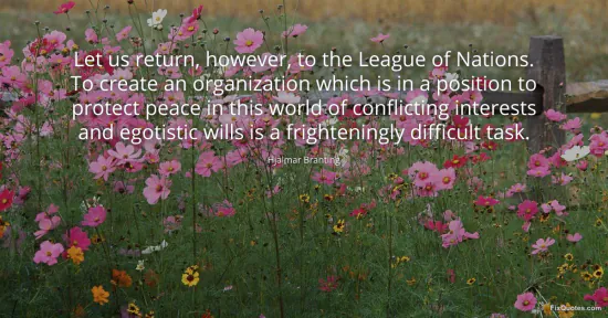 Branting, Hjalmar. "Let us return, however, to the League of Nations. To create an organization which is in a position to protect peace in this world of conflicting interests and egotistic wills is a frighteningly difficult task." FixQuotes. January 17, 2026. https://fixquotes.com/quotes/let-us-return-however-to-the-league-of-nations-to-69612/.