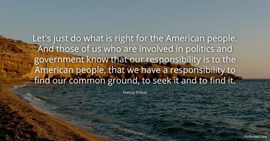 Pelosi, Nancy. (2026, January 15). Let's just do what is right for the American people. And those of us who are involved in politics and government know that our responsibility is to the American people, that we have a responsibility to find our common ground, to seek it and to find it. FixQuotes. https://fixquotes.com/quotes/lets-just-do-what-is-right-for-the-american-969/