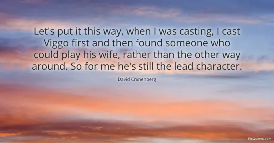 Cronenberg, David. "Let's put it this way, when I was casting, I cast Viggo first and then found someone who could play his wife, rather than the other way around. So for me he's still the lead character." FixQuotes. January 17, 2026. https://fixquotes.com/quotes/lets-put-it-this-way-when-i-was-casting-i-cast-47047/.