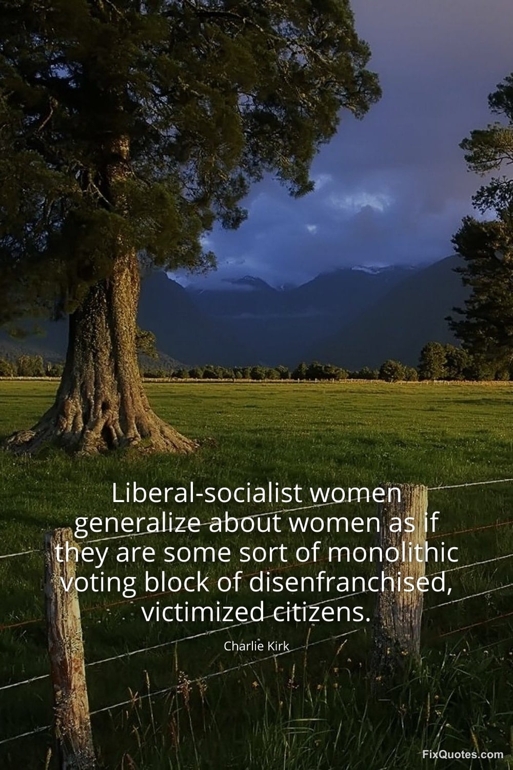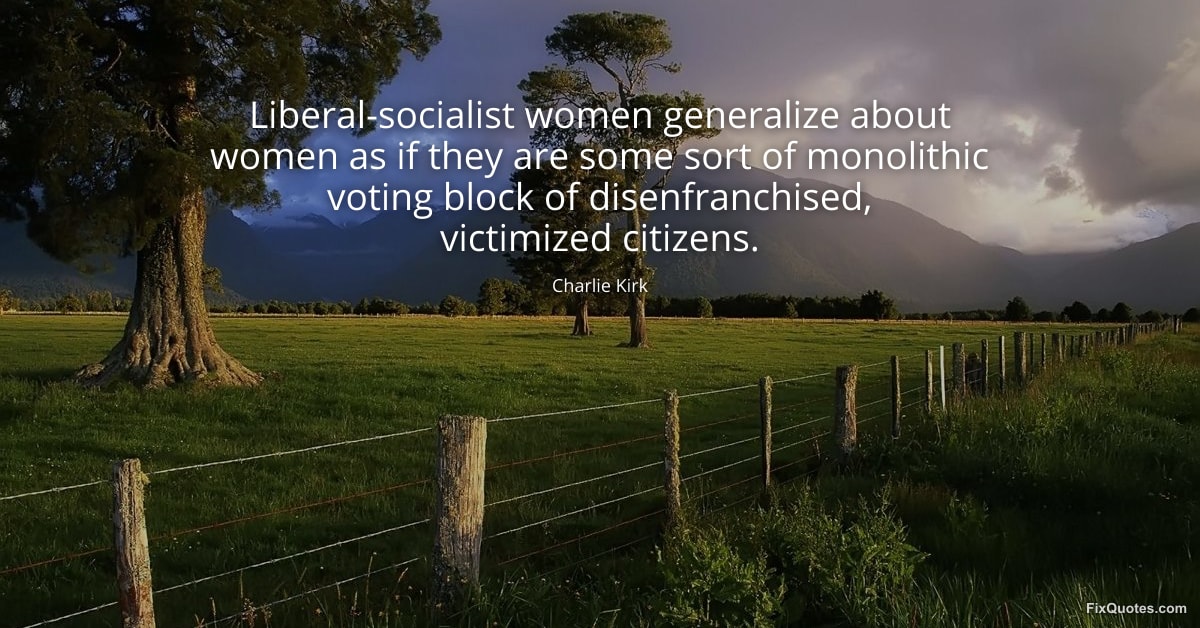 Kirk, Charlie. (2026, January 14). Liberal-socialist women generalize about women as if they are some sort of monolithic voting block of disenfranchised, victimized citizens. FixQuotes. https://fixquotes.com/quotes/liberal-socialist-women-generalize-about-women-as-173193/