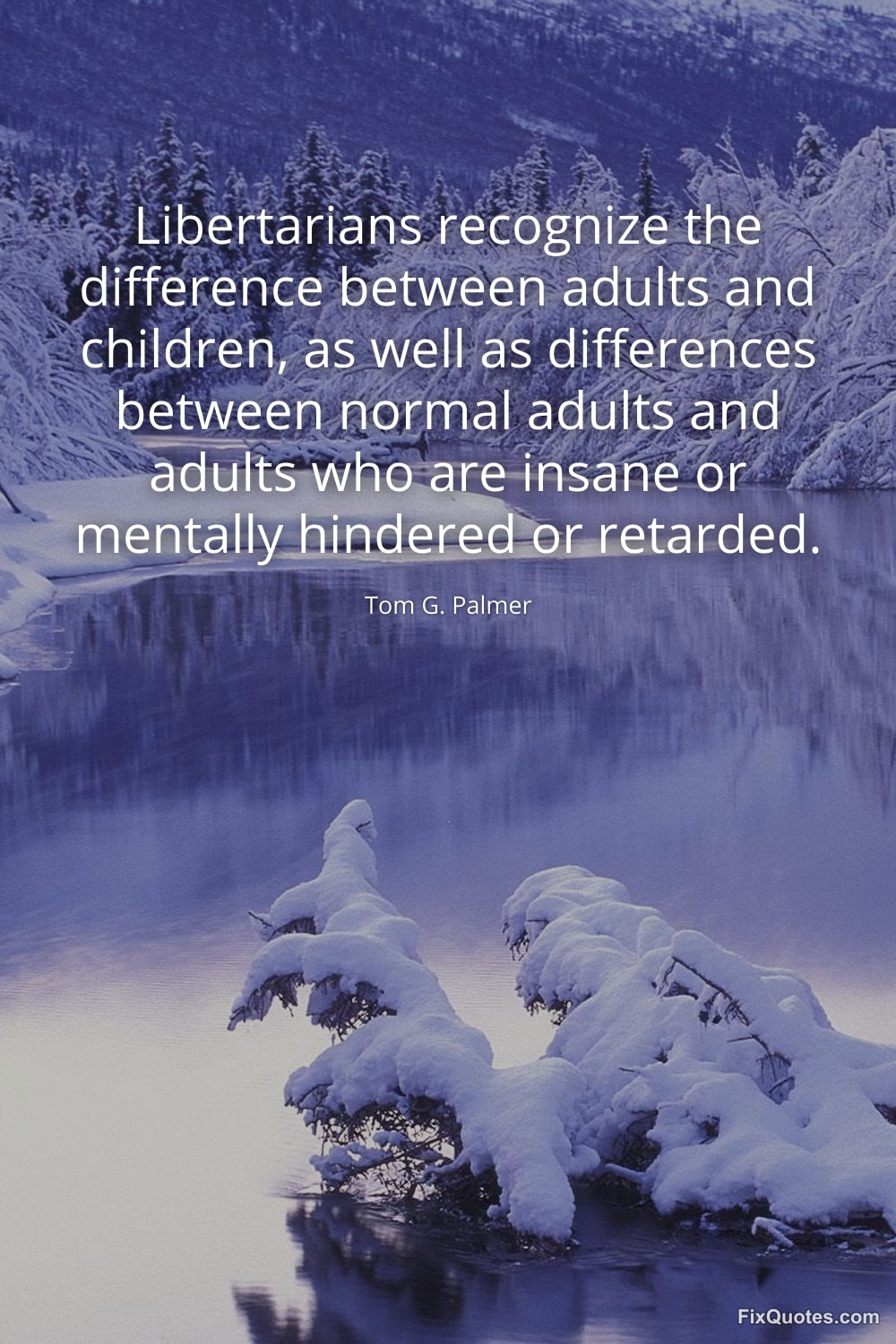 "Libertarians recognize the difference between adults and children, as well as differences between normal adults and adults who are insane or mentally hindered or retarded." FixQuotes, 17 Jan. 2026, https://fixquotes.com/quotes/libertarians-recognize-the-difference-between-71755/. Accessed 12 Feb. 2026.