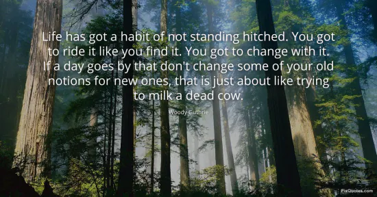Guthrie, Woody. "Life has got a habit of not standing hitched. You got to ride it like you find it. You got to change with it. If a day goes by that don't change some of your old notions for new ones, that is just about like trying to milk a dead cow." FixQuotes. January 15, 2026. https://fixquotes.com/quotes/life-has-got-a-habit-of-not-standing-hitched-you-170425/.