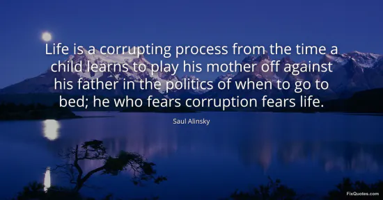 Alinsky, Saul. (2026, January 17). Life is a corrupting process from the time a child learns to play his mother off against his father in the politics of when to go to bed; he who fears corruption fears life. FixQuotes. https://fixquotes.com/quotes/life-is-a-corrupting-process-from-the-time-a-81146/