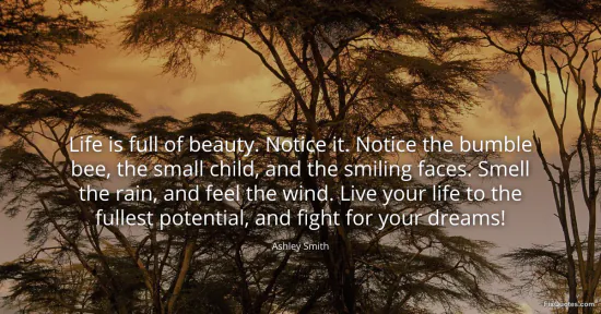 Smith, Ashley. "Life is full of beauty. Notice it. Notice the bumble bee, the small child, and the smiling faces. Smell the rain, and feel the wind. Live your life to the fullest potential, and fight for your dreams!" FixQuotes. February 18, 2026. https://fixquotes.com/quotes/life-is-full-of-beauty-notice-it-notice-the-98057/.