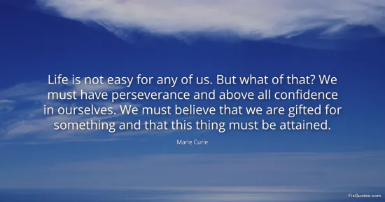 Curie, Marie. "Life is not easy for any of us. But what of that? We must have perseverance and above all confidence in ourselves. We must believe that we are gifted for something and that this thing must be attained." FixQuotes. January 15, 2026. https://fixquotes.com/quotes/life-is-not-easy-for-any-of-us-but-what-of-that-713/.