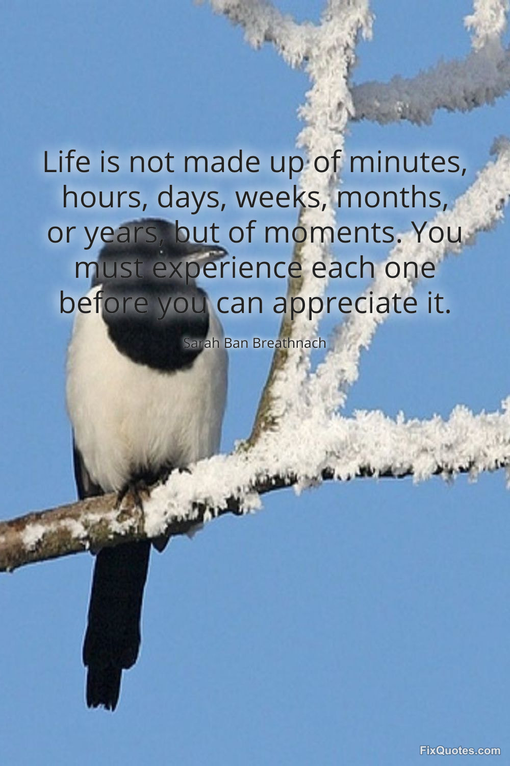 Breathnach, Sarah Ban. (2026, January 11). Life is not made up of minutes, hours, days, weeks, months, or years, but of moments. You must experience each one before you can appreciate it. FixQuotes. https://fixquotes.com/quotes/life-is-not-made-up-of-minutes-hours-days-weeks-183939/