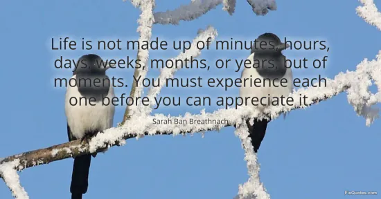 Breathnach, Sarah Ban. "Life is not made up of minutes, hours, days, weeks, months, or years, but of moments. You must experience each one before you can appreciate it." FixQuotes. January 11, 2026. https://fixquotes.com/quotes/life-is-not-made-up-of-minutes-hours-days-weeks-183939/.