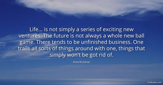 Brookner, Anita. (2026, January 17). Life... is not simply a series of exciting new ventures. The future is not always a whole new ball game. There tends to be unfinished business. One trails all sorts of things around with one, things that simply won't be got rid of. FixQuotes. https://fixquotes.com/quotes/life-is-not-simply-a-series-of-exciting-new-44162/