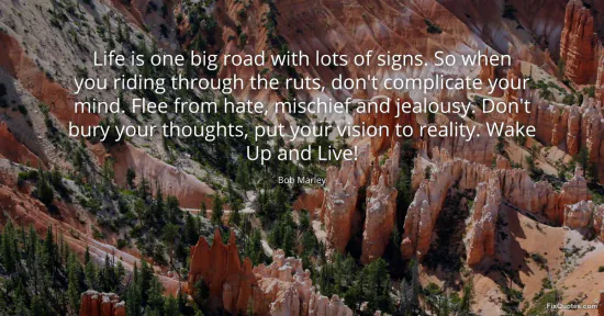 Marley, Bob. "Life is one big road with lots of signs. So when you riding through the ruts, don't complicate your mind. Flee from hate, mischief and jealousy. Don't bury your thoughts, put your vision to reality. Wake Up and Live!" FixQuotes. January 17, 2026. https://fixquotes.com/quotes/life-is-one-big-road-with-lots-of-signs-so-when-30277/.
