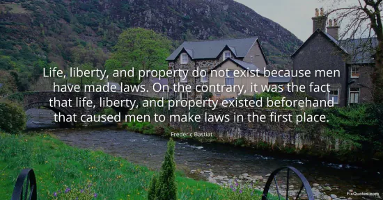 Bastiat, Frederic. "Life, liberty, and property do not exist because men have made laws. On the contrary, it was the fact that life, liberty, and property existed beforehand that caused men to make laws in the first place." FixQuotes. January 16, 2026. https://fixquotes.com/quotes/life-liberty-and-property-do-not-exist-because-136175/.