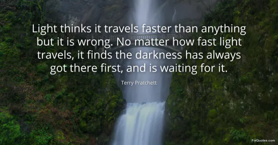 Pratchett, Terry. (2026, February 9). Light thinks it travels faster than anything but it is wrong. No matter how fast light travels, it finds the darkness has always got there first, and is waiting for it. FixQuotes. https://fixquotes.com/quotes/light-thinks-it-travels-faster-than-anything-but-23684/