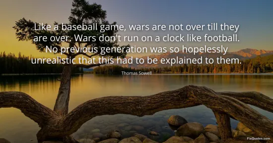 Sowell, Thomas. "Like a baseball game, wars are not over till they are over. Wars don't run on a clock like football. No previous generation was so hopelessly unrealistic that this had to be explained to them." FixQuotes. January 18, 2026. https://fixquotes.com/quotes/like-a-baseball-game-wars-are-not-over-till-they-2129/.