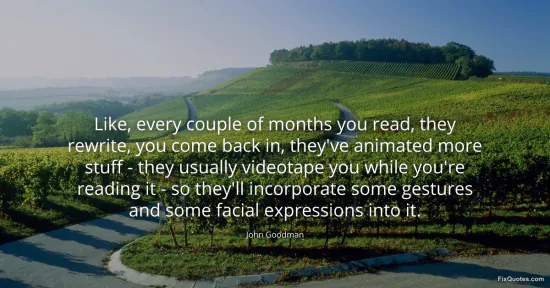 Goodman, John. "Like, every couple of months you read, they rewrite, you come back in, they've animated more stuff - they usually videotape you while you're reading it - so they'll incorporate some gestures and some facial expressions into it." FixQuotes. January 17, 2026. https://fixquotes.com/quotes/like-every-couple-of-months-you-read-they-rewrite-64405/.