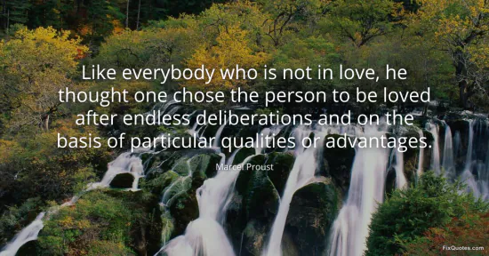 Proust, Marcel. "Like everybody who is not in love, he thought one chose the person to be loved after endless deliberations and on the basis of particular qualities or advantages." FixQuotes. January 18, 2026. https://fixquotes.com/quotes/like-everybody-who-is-not-in-love-he-thought-one-20171/.