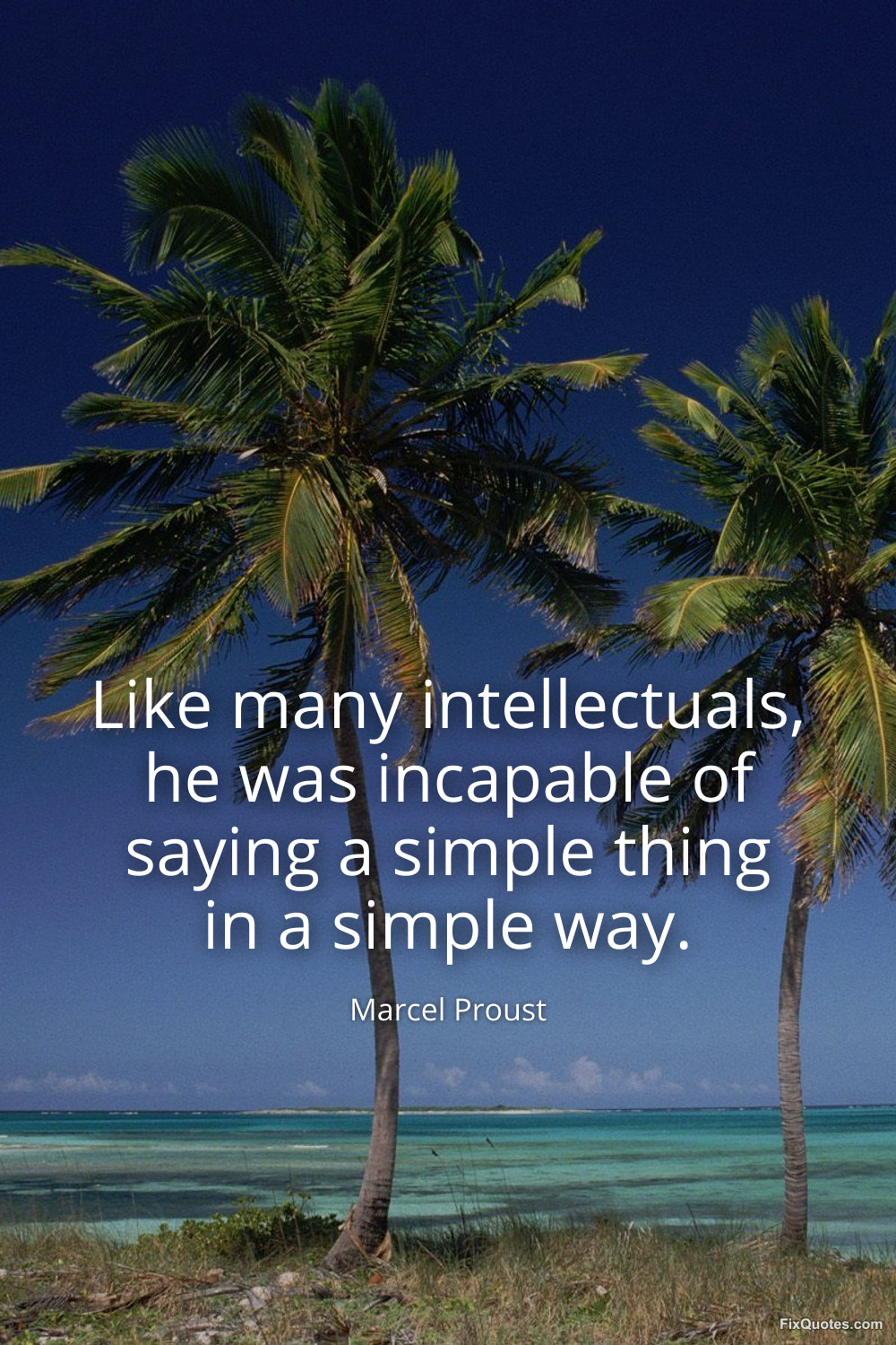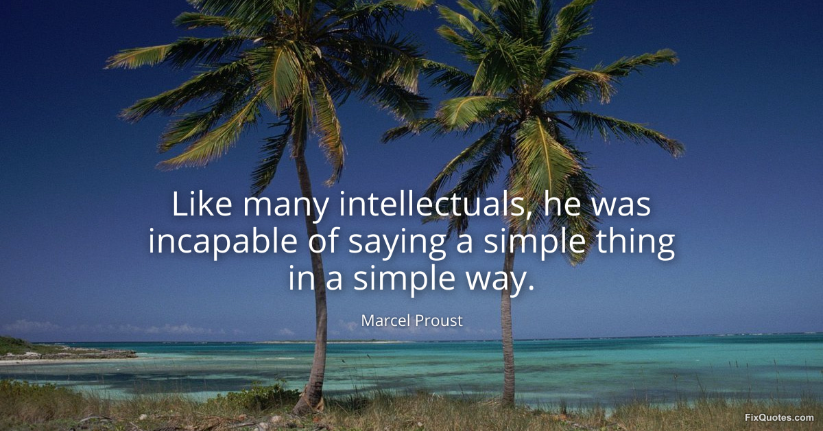 Proust, Marcel. "Like many intellectuals, he was incapable of saying a simple thing in a simple way." FixQuotes. February 28, 2026. https://fixquotes.com/quotes/like-many-intellectuals-he-was-incapable-of-20172/.