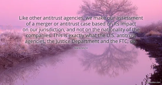 Monti, Mario. (2026, February 18). Like other antitrust agencies, we make our assessment of a merger or antitrust case based on its impact on our jurisdiction, and not on the nationality of the companies. This is exactly what the U.S. antitrust agencies, the Justice Department and the FTC, do. FixQuotes. https://fixquotes.com/quotes/like-other-antitrust-agencies-we-make-our-72680/