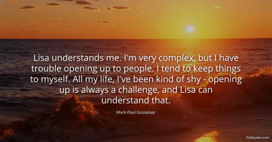Gosselaar, Mark-Paul. (2026, February 18). Lisa understands me. I'm very complex, but I have trouble opening up to people. I tend to keep things to myself. All my life, I've been kind of shy - opening up is always a challenge, and Lisa can understand that. FixQuotes. https://fixquotes.com/quotes/lisa-understands-me-im-very-complex-but-i-have-79567/