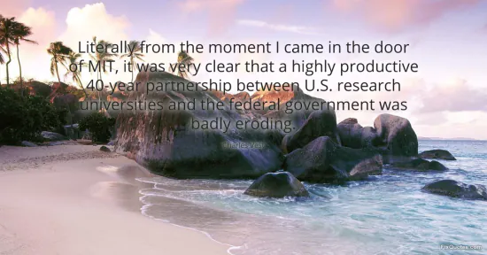 Vest, Charles. "Literally from the moment I came in the door of MIT, it was very clear that a highly productive 40-year partnership between U.S. research universities and the federal government was badly eroding." FixQuotes. January 17, 2026. https://fixquotes.com/quotes/literally-from-the-moment-i-came-in-the-door-of-73484/.