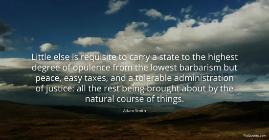 "Little else is requisite to carry a state to the highest degree of opulence from the lowest barbarism but peace, easy taxes, and a tolerable administration of justice: all the rest being brought about by the natural course of things." FixQuotes, 17 Jan. 2026, https://fixquotes.com/quotes/little-else-is-requisite-to-carry-a-state-to-the-29532/. Accessed 22 Feb. 2026.