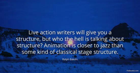 Bakshi, Ralph. (2026, January 16). Live action writers will give you a structure, but who the hell is talking about structure? Animation is closer to jazz than some kind of classical stage structure. FixQuotes. https://fixquotes.com/quotes/live-action-writers-will-give-you-a-structure-but-101347/