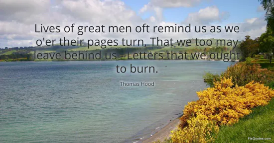 Hood, Thomas. "Lives of great men oft remind us as we o'er their pages turn, That we too may leave behind us - Letters that we ought to burn." FixQuotes. January 16, 2026. https://fixquotes.com/quotes/lives-of-great-men-oft-remind-us-as-we-oer-their-107127/.