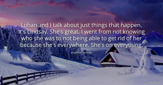 Bennett, Jonathan. "Lohan and I talk about just things that happen. It's Lindsay. She's great. I went from not knowing who she was to not being able to get rid of her because she's everywhere. She's on everything." FixQuotes. January 18, 2026. https://fixquotes.com/quotes/lohan-and-i-talk-about-just-things-that-happen-15354/.