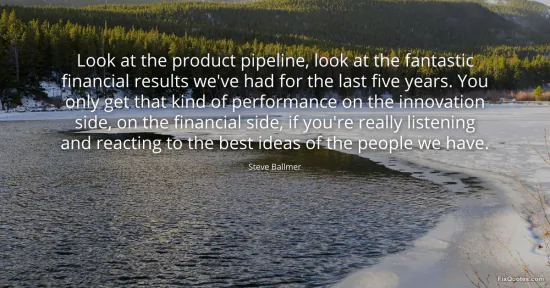 Ballmer, Steve. "Look at the product pipeline, look at the fantastic financial results we've had for the last five years. You only get that kind of performance on the innovation side, on the financial side, if you're really listening and reacting to the best ideas of the people we have." FixQuotes. January 16, 2026. https://fixquotes.com/quotes/look-at-the-product-pipeline-look-at-the-106878/.