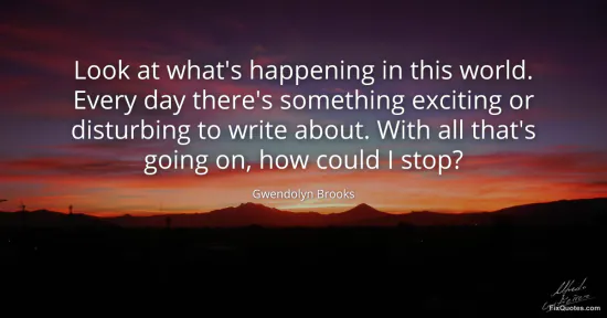 Brooks, Gwendolyn. "Look at what's happening in this world. Every day there's something exciting or disturbing to write about. With all that's going on, how could I stop?" FixQuotes. January 15, 2026. https://fixquotes.com/quotes/look-at-whats-happening-in-this-world-every-day-148492/.