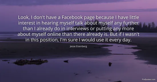 Eisenberg, Jesse. "Look, I don't have a Facebook page because I have little interest in hearing myself talk about myself any further than I already do in interviews or putting any more about myself online than there already is. But if I wasn't in this position, I'm sure I would use it every day." FixQuotes. January 17, 2026. https://fixquotes.com/quotes/look-i-dont-have-a-facebook-page-because-i-have-78590/.