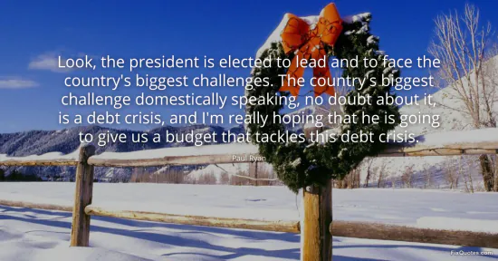 Ryan, Paul. (2026, January 16). Look, the president is elected to lead and to face the country's biggest challenges. The country's biggest challenge domestically speaking, no doubt about it, is a debt crisis, and I'm really hoping that he is going to give us a budget that tackles this debt crisis. FixQuotes. https://fixquotes.com/quotes/look-the-president-is-elected-to-lead-and-to-face-91010/