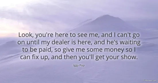Pop, Iggy. (2026, January 16). Look, you're here to see me, and I can't go on until my dealer is here, and he's waiting to be paid, so give me some money so I can fix up, and then you'll get your show. FixQuotes. https://fixquotes.com/quotes/look-youre-here-to-see-me-and-i-cant-go-on-until-121365/