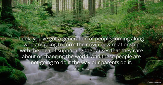 Norton, Edward. (2026, January 17). Look, you've got a generation of people coming along who are going to form their own new relationship with the idea of supporting the causes that they care about or changing the world. And these people are not going to do it the way our parents do it. FixQuotes. https://fixquotes.com/quotes/look-youve-got-a-generation-of-people-coming-50081/