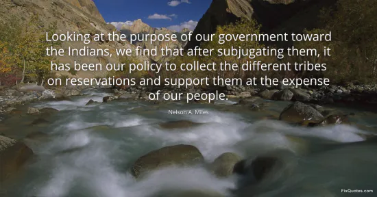 Miles, Nelson A. "Looking at the purpose of our government toward the Indians, we find that after subjugating them, it has been our policy to collect the different tribes on reservations and support them at the expense of our people." FixQuotes. February 18, 2026. https://fixquotes.com/quotes/looking-at-the-purpose-of-our-government-toward-71647/.