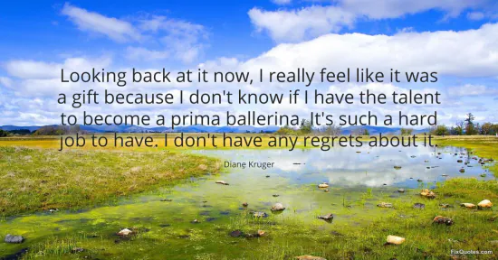 Kruger, Diane. "Looking back at it now, I really feel like it was a gift because I don't know if I have the talent to become a prima ballerina. It's such a hard job to have. I don't have any regrets about it." FixQuotes. January 15, 2026. https://fixquotes.com/quotes/looking-back-at-it-now-i-really-feel-like-it-was-150452/.