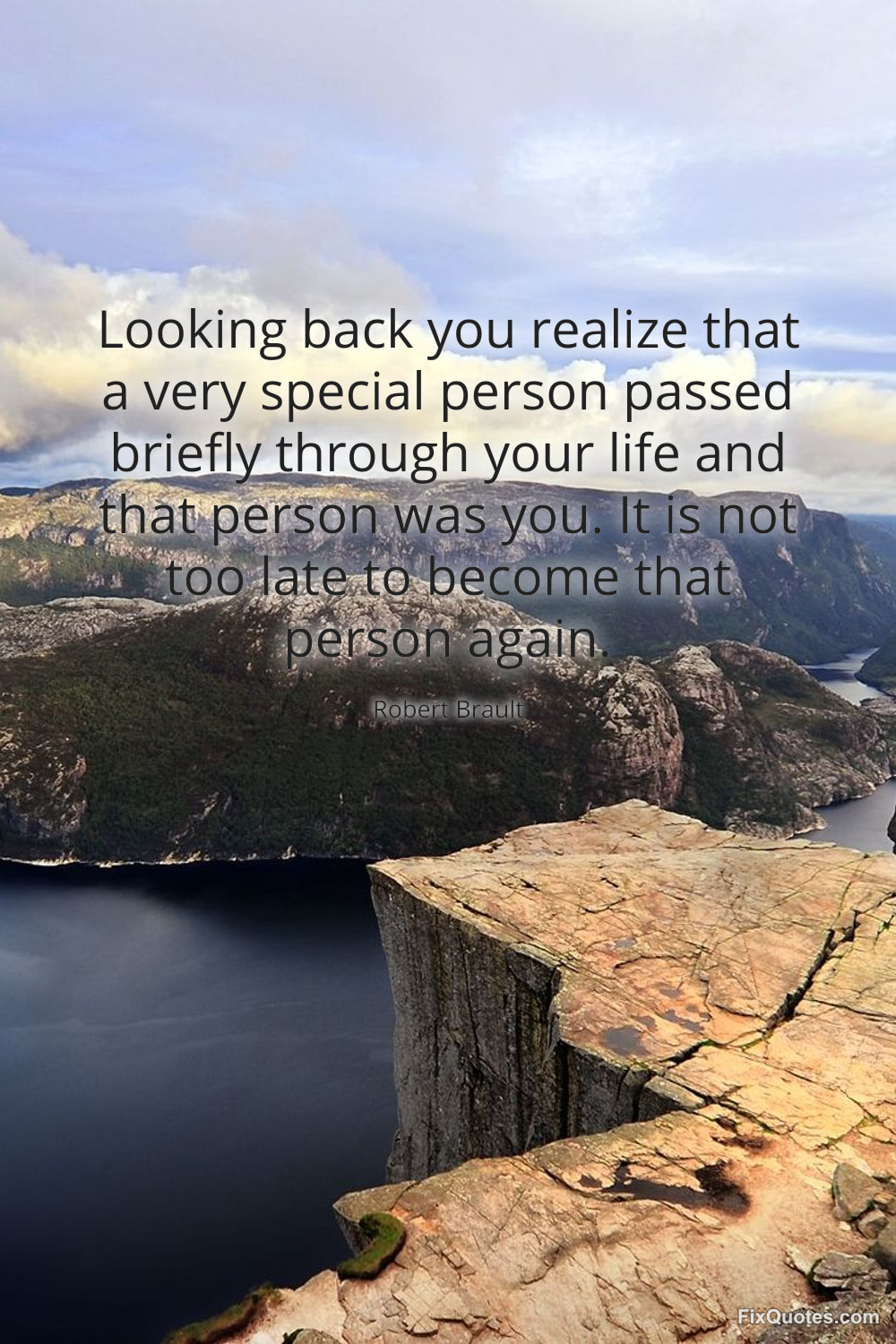 "Looking back you realize that a very special person passed briefly through your life and that person was you. It is not too late to become that person again." FixQuotes, 11 Jan. 2026, https://fixquotes.com/quotes/looking-back-you-realize-that-a-very-special-183916/. Accessed 12 Feb. 2026.