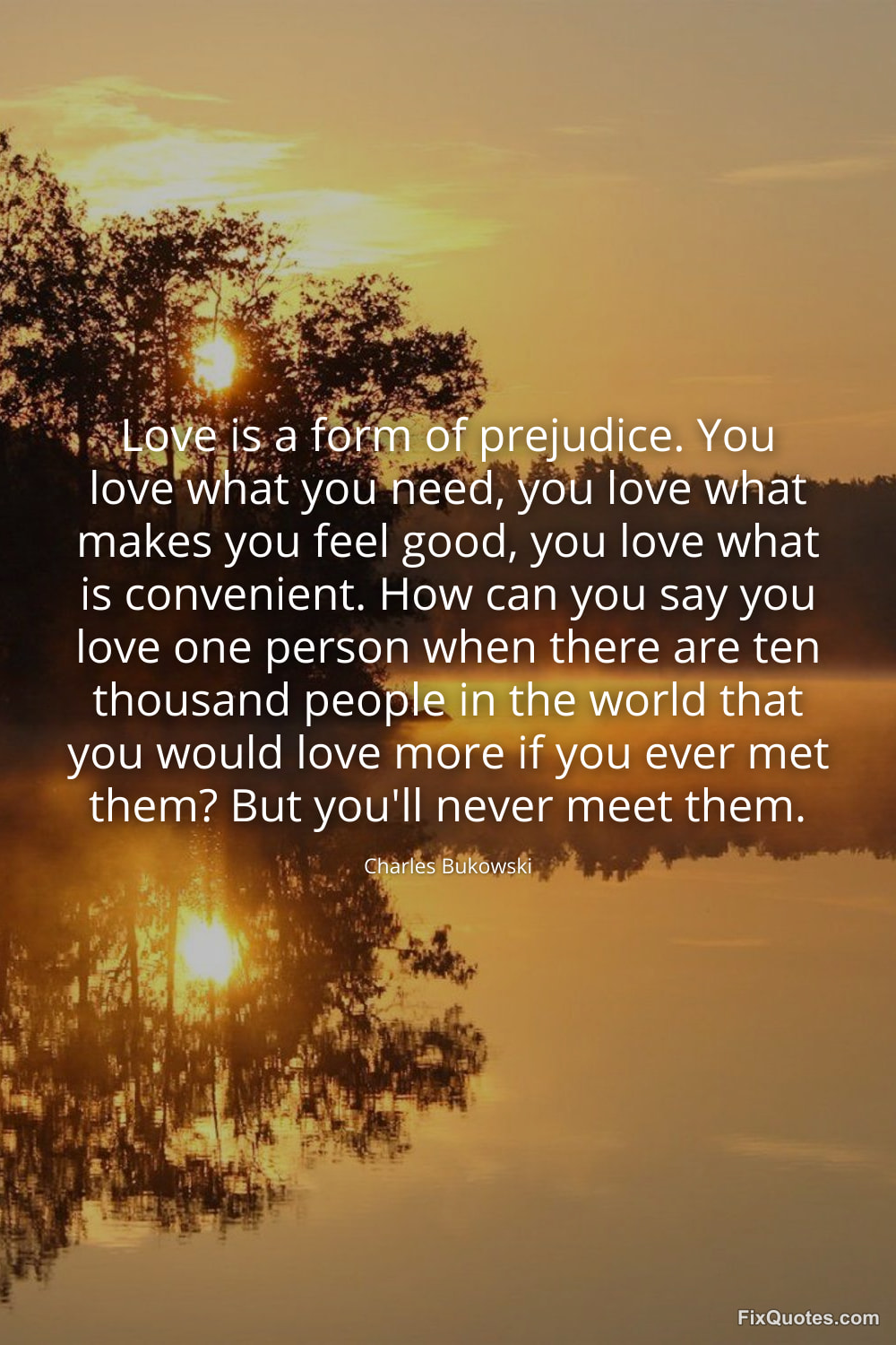 Bukowski, Charles. (2026, February 10). Love is a form of prejudice. You love what you need, you love what makes you feel good, you love what is convenient. How can you say you love one person when there are ten thousand people in the world that you would love more if you ever met them? But you'll never meet them. FixQuotes. https://fixquotes.com/quotes/love-is-a-form-of-prejudice-you-love-what-you-185180/