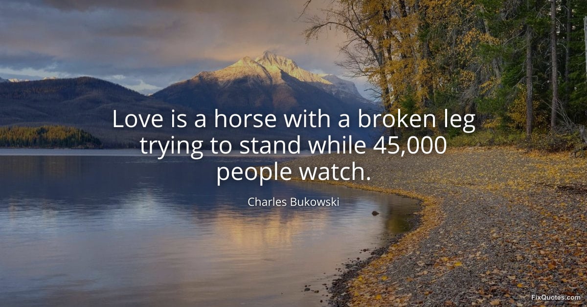 Bukowski, Charles. "Love is a horse with a broken leg trying to stand while 45,000 people watch." FixQuotes. February 10, 2026. https://fixquotes.com/quotes/love-is-a-horse-with-a-broken-leg-trying-to-stand-185256/.